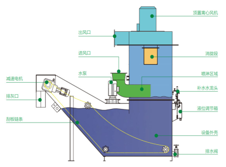 除塵系統(tǒng)運(yùn)行中,收集罩把粉塵產(chǎn)生源將煙塵/粉塵捕集起來(lái),通過(guò)管道系統(tǒng)輸送到分離器的進(jìn)風(fēng)口,之后進(jìn)入噴淋區(qū)域,在最近的位置通過(guò)氣